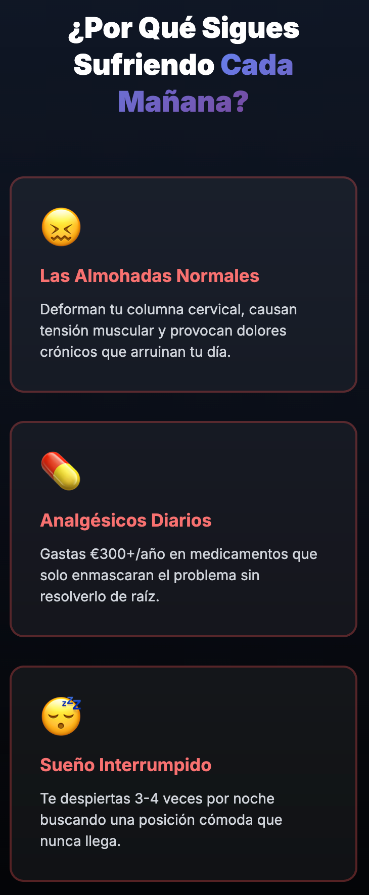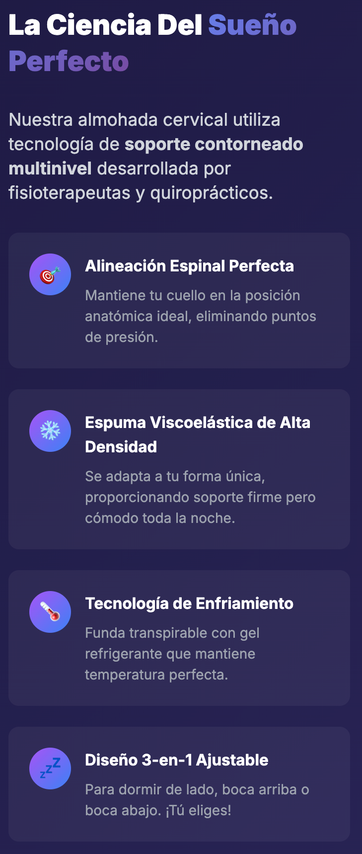 A diferencia de las almohadas tradicionales que deforman tu columna y causan dolor crónico, nuestro diseño contorneado multinivel mantiene tu cuello en perfecta alineación durante toda la noche, eliminando puntos de presión y tensión muscular.