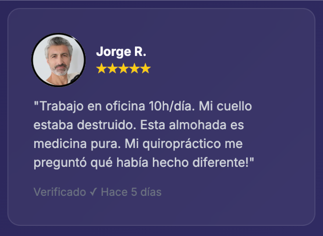 “Trabajo muchas horas sentado y el dolor cervical era constante. Esta almohada mantiene el cuello en buena posición y ahora me levanto sin molestias. Duermo más profundo y relajado.”